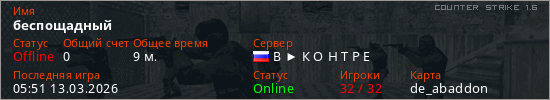 Играет на Counter Strike 1.6 сервере. Страна: РоссияПервый раз замечен 09:49 05.03.2026