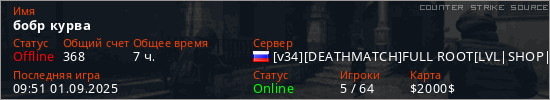 Играет на Counter Strike Source сервере. Страна: РоссияПервый раз замечен 14:28 28.01.2023