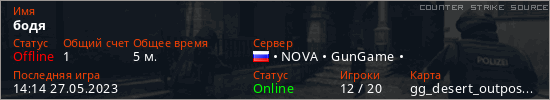 Играет на Counter Strike Source сервере. Страна: РоссияПервый раз замечен 13:43 27.05.2023