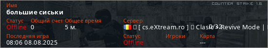 Играет на Counter Strike 1.6 сервере. Страна: РумынияПервый раз замечен 08:04 08.08.2025