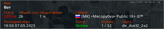 Играет на Counter Strike 1.6 сервере. Страна: РоссияПервый раз замечен 14:02 03.05.2023
