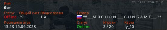 Играет на Counter Strike 1.6 сервере. Страна: РоссияПервый раз замечен 20:50 02.01.2023