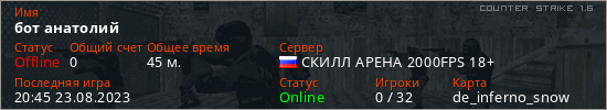 Играет на Counter Strike 1.6 сервере. Страна: РоссияПервый раз замечен 20:30 15.08.2023