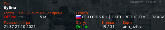 Играет на Counter Strike 1.6 сервере. Страна: РоссияПервый раз замечен 21:35 27.10.2024