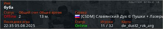 Играет на Counter Strike 1.6 сервере. Страна: РоссияПервый раз замечен 18:06 02.08.2025