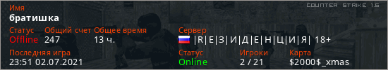 Играет на Counter Strike 1.6 сервере. Страна: РоссияПервый раз замечен 12:32 28.12.2020