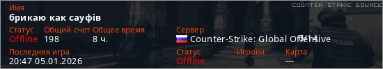 Играет на Counter Strike Source сервере. Страна: РоссияПервый раз замечен 16:37 21.11.2025