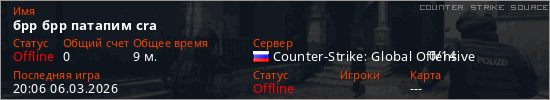 Играет на Counter Strike Source сервере. Страна: РоссияПервый раз замечен 21:09 02.03.2026