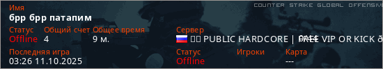 Играет на Counter Strike Global Offensive сервере. Страна: РоссияПервый раз замечен 10:54 03.06.2025