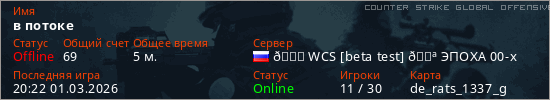 Играет на Counter Strike Global Offensive сервере. Страна: РоссияПервый раз замечен 20:01 01.03.2026