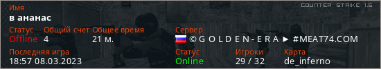 Играет на Counter Strike 1.6 сервере. Страна: РоссияПервый раз замечен 18:39 08.03.2023