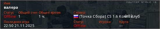 Играет на Counter Strike 1.6 сервере. Страна: РоссияПервый раз замечен 22:30 12.10.2025
