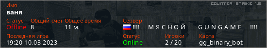 Играет на Counter Strike 1.6 сервере. Страна: РоссияПервый раз замечен 12:14 10.03.2023