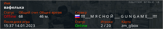 Играет на Counter Strike 1.6 сервере. Страна: РоссияПервый раз замечен 14:53 14.01.2023