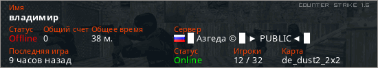 Играет на Counter Strike 1.6 сервере. Страна: РоссияПервый раз замечен 12:10 16.03.2026