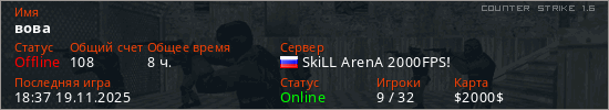 Играет на Counter Strike 1.6 сервере. Страна: РоссияПервый раз замечен 21:06 25.10.2022