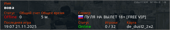 Играет на Counter Strike 1.6 сервере. Страна: РоссияПервый раз замечен 18:33 21.11.2025