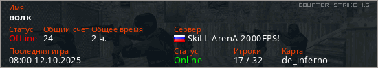 Играет на Counter Strike 1.6 сервере. Страна: РоссияПервый раз замечен 16:00 25.10.2022