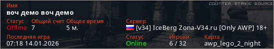 Играет на Counter Strike Source сервере. Страна: РоссияПервый раз замечен 07:08 14.01.2026