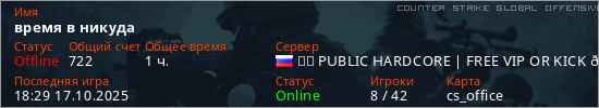 Играет на Counter Strike Global Offensive сервере. Страна: РоссияПервый раз замечен 17:41 25.09.2025