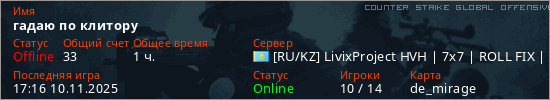 Играет на Counter Strike Global Offensive сервере. Страна: КазахстанПервый раз замечен 16:33 21.10.2025