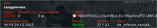 Последний раз был в сети 16:19 29.12.2025 Игрок с таким ником замечен на 6 серверах