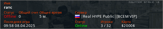 Играет на Counter Strike 1.6 сервере. Страна: РоссияПервый раз замечен 09:56 08.04.2025