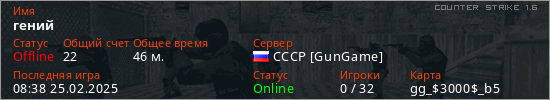 Последний раз был в сети 08:38 25.02.2025 Игрок с таким ником замечен на 32 серверах