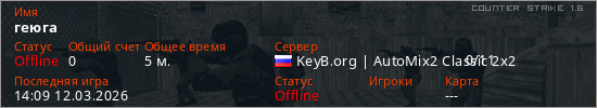 Играет на Counter Strike 1.6 сервере. Страна: РоссияПервый раз замечен 13:57 12.03.2026
