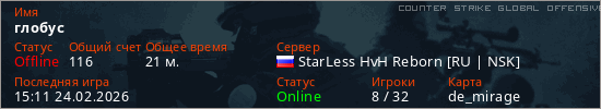 Играет на Counter Strike Global Offensive сервере. Страна: РоссияПервый раз замечен 09:05 24.02.2026