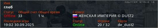 Последний раз был в сети 19:02 30.09.2025 Игрок с таким ником замечен на 30 серверах