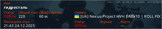 Играет на Counter Strike Global Offensive сервере. Страна: УкраинаПервый раз замечен 22:19 17.12.2025