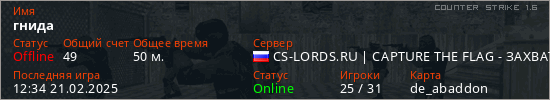 Играет на Counter Strike 1.6 сервере. Страна: РоссияПервый раз замечен 20:18 08.10.2022
