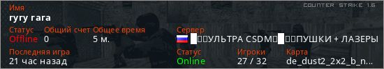 Играет на Counter Strike 1.6 сервере. Страна: РоссияПервый раз замечен 22:23 13.03.2026