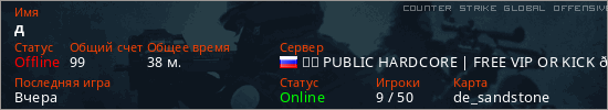 Играет на Counter Strike Global Offensive сервере. Страна: РоссияПервый раз замечен 16:39 02.09.2025