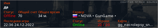 Играет на Counter Strike Source сервере. Страна: РоссияПервый раз замечен 17:49 16.12.2022