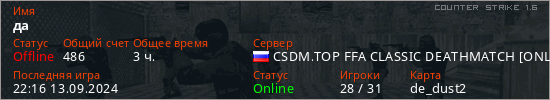 Играет на Counter Strike 1.6 сервере. Страна: РоссияПервый раз замечен 12:47 02.11.2021