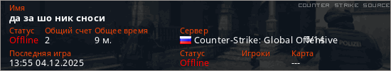 Играет на Counter Strike Source сервере. Страна: РоссияПервый раз замечен 17:51 31.10.2025