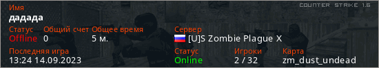 Играет на Counter Strike 1.6 сервере. Страна: РоссияПервый раз замечен 13:04 14.09.2023