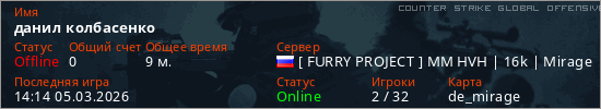 Играет на Counter Strike Global Offensive сервере. Страна: РоссияПервый раз замечен 18:25 04.03.2026