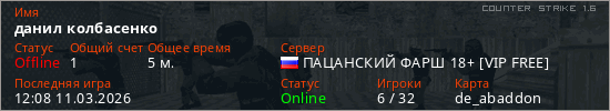 Играет на Counter Strike 1.6 сервере. Страна: РоссияПервый раз замечен 11:58 11.03.2026