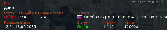 Последний раз был в сети 12:21 18.05.2025 Игрок с таким ником замечен на 36 серверах