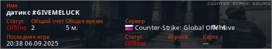 Играет на Counter Strike Source сервере. Страна: РоссияПервый раз замечен 20:21 06.09.2025