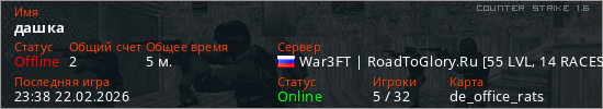 Играет на Counter Strike 1.6 сервере. Страна: РоссияПервый раз замечен 23:29 22.02.2026