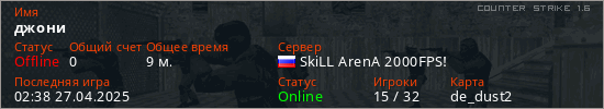 Играет на Counter Strike 1.6 сервере. Страна: РоссияПервый раз замечен 02:12 27.04.2025