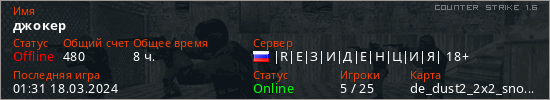 Играет на Counter Strike 1.6 сервере. Страна: РоссияПервый раз замечен 13:31 01.09.2019