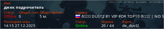 Играет на Counter Strike Global Offensive сервере. Страна: РоссияПервый раз замечен 14:09 27.12.2025