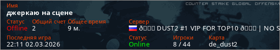 Играет на Counter Strike Global Offensive сервере. Страна: РоссияПервый раз замечен 20:55 02.03.2026
