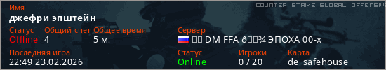 Играет на Counter Strike Global Offensive сервере. Страна: РоссияПервый раз замечен 22:45 23.02.2026