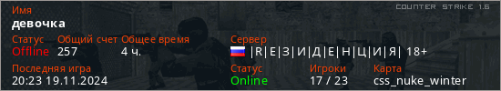 Играет на Counter Strike 1.6 сервере. Страна: РоссияПервый раз замечен 17:51 23.02.2020